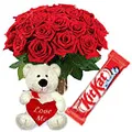 24 Red Dutch Roses Bouquet with Cadburys Chocolate and small teddy bear.