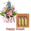 Diwali Gift of Mixed Seasonal Flower Bouquet with Kaju Katli 500 gms. Gross weight applies.