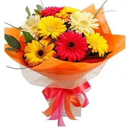 Bouquet of 10 Colourful Gerberas with 2 Cadbury dairy Milk Bar (13gms each) and 6 inch Small Teddy.