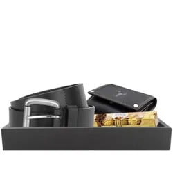 Bring the feeling of happiness by sending this delicious Ferrero Rocher Chocolate with Wallet N Belt for Men into the life of your most special person. This Combo Gift consists of 1 pc Longhorns Wallet (Black Colour, Multi Pocket, Leather Wallet for Men), 1 pc Buffalo Belt (Black Colour, Leather Belt for Men), 1 pc Ferrero Rocher Chocolates (4pc pack) and 1 pc Tray (Wooden).