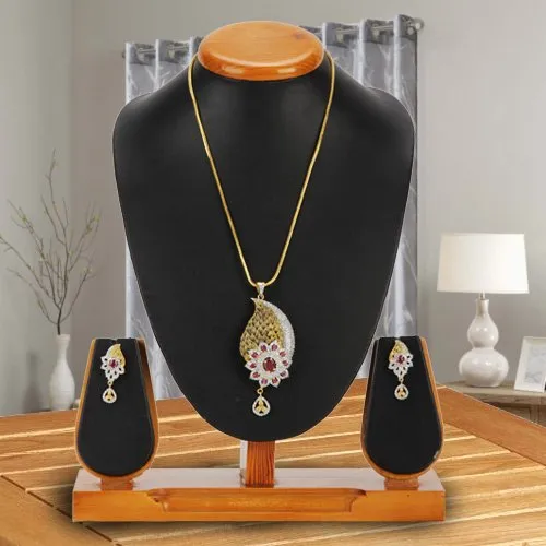 This Mesmerizing Pendant and Earrings Set is a superlative souvenir to delight a newly acquainted mellow beauty and to thus leave a resonant memory in her thoughts. This tantalizing Twosome constitutes an exquisite Gold Plated Neck Wear, coming with a gripping Peacock and Flower Crafted Locket, and a wondrous pair of similarly crafted Ear Tops. Both the Locket and the Ear Tops are embellished with Red Stones.