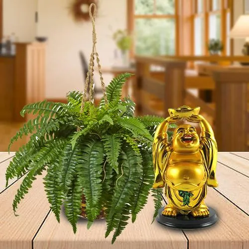 Convey your heartfelt wishes by gifting this Elegant Selection of Hanging Bostern Fern Plant with Laughing Buddha Idol to the people dearest to you.