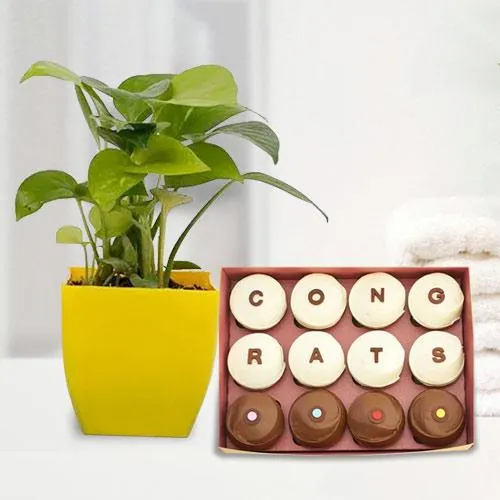 Online delivery of best wishes along with this Elegant Gift of Money Plant with Homemade Chocolates for your dear ones. Celebrate a friend or an associate’s success with good fortune and precious treasures in the form of this lovely Gift comprising of beautiful Money Plant in Plastic Pot with "CONGRATS" Handmade Chocolate.