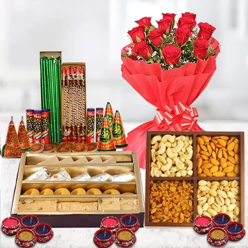 This big Diwali Hamper consists of Diwali Crackers, Assorted Sweets 500 Gms., Dry Fruits 500 Gms., 6 Wax Diya and 12 Red Roses