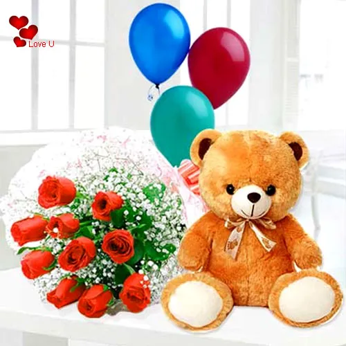 Create a lifelong impression upon the ones you adore by gifting them this Straight from the Heart V-day Gift Combo that clearly conveys how much you love them. This Gift will make a lovely V-day collection as it features 8” tall Teddy and 3 Colorful Balloons with a charming bunch of 12 Red Roses.