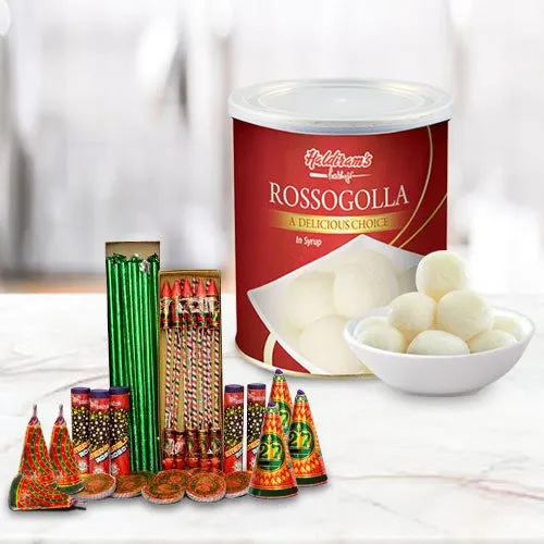 Amaze your loved ones by gifting them this Spectacular Cradle of Haldiram Rasgulla with Crackers and make them crave for more. This Combo is highly irresistible with 1 kg Haldiram Rasgulla and Crackers. Note: Types of Fire Crackers depend upon their availability.