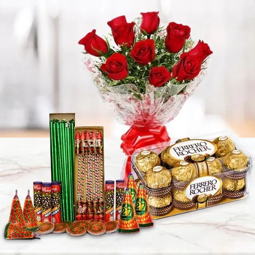 Mould your relationships into more special ones by sending this Marvelous Combo of 16 pcs Ferrero Rocher Chocolates, 10 pcs Red Rose Bunch and Crackers to the people you adore. Note: Types of Fire Crackers depend upon their availability.