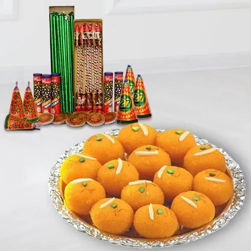Bestow loads of gladness to your dear ones with this present of Desirable Dazzle Diwali Gathering and mold their festival time into a delightful one. This delightful Duo displays 500 gms (Gross Weight) Boondi Ladoo and Crackers. Note: Types of Fire Crackers depend upon their availability.