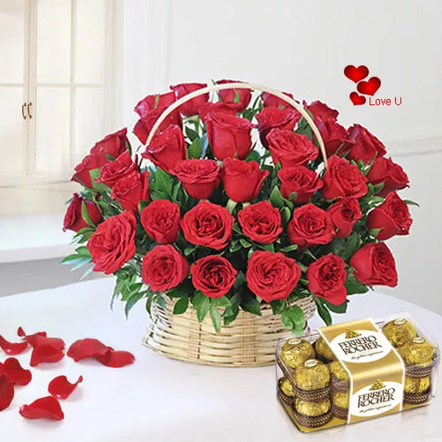 Make your dear one very happy and delighted on Valentine's Day with this Sweetest Equation of Two Hearts Valentine Combo containing your love for his/her. This Gift Combo contains a beautiful bouquet of 40 Red Roses and a Box of 16 Pcs Ferrero Rocher Chocolates.