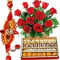 1/2 Kg. Assorted Sweets and 12 Red Roses Basket with 1 Free Rakhi, Roli Tika, Chawal