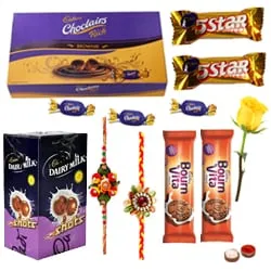 Cadbury’s Assorted Chocolates( 2 Pcs. Cadbury’s 5 Star Bar ( 20.5 gms), 2 Pcs. Cadbury’s Bournvita Chocolate Cookies, 25 Pcs. Cadbury’s Choclairs Gold Pack, 56 Pcs. Cadbury’s Chocolate Shots) with 2 Rakhi with One Yellow Rose and Roli Tilak and Chawal