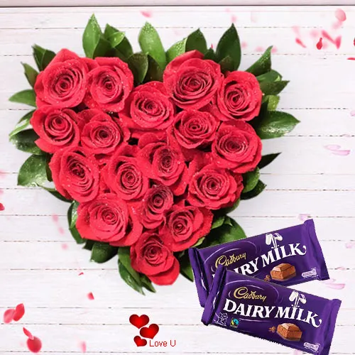 This valentine day, surprise your beloved by giving this Excellent 18 Red Roses in Heart Shape Arrangement with 2 Cadbury Dairy Milk Chocolate Bar.