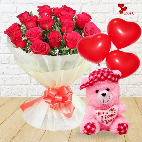 Send this Valentine Gift of 10 Red Rose Bouquet with 12 inch Teddy and 3 Balloons to express your love and affection.