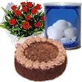 12 Red Roses and Rasgulla with 1 kg Chocolate Eggless Cake - Express your heartfelt emotions with this combination of 12 Red Roses,Rasgullas and 1 kg Chocolate Cake (Eggless).