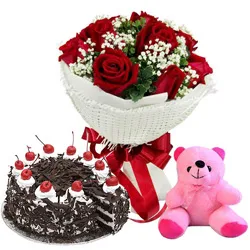 Carve your way to the hearts of the ones you admire by gifting this Anniversary Everlasting 10 Red Rose Bouquet with Famous Black Forest Cake 2.2lb N Small Teddy that they will forever keep close to their heart.