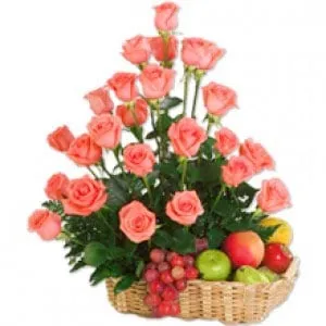 24 Pink Roses with 2 kg Fresh Fruits Basket