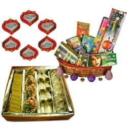 1 Kg. Gms. Assorted Sweets, Crackers and 6 Wax Diya