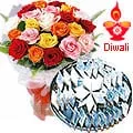 Kaju Katli with 24 Mixed Roses Bouquet - mixed Roses (24) and delicious Kaju Barfi 1 Kg.