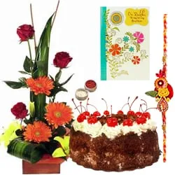 This Rakhi, send a meaningful gesture packed with freshness, flavor, and love. The hamper begins with a delightful bouquet of seasonal flowers—hand-tied and bursting with fragrance, bringing a sense of joy and serenity. To sweeten the day, a 1 lb cake made from the finest ingredients awaits—moist, flavorful, and made to perfection. Whether shared at home or sent across the miles, it’s a treat that turns moments into memories. A stylish rakhi is included at no cost, ensuring the spirit of the festival is honored in full, with every thread of love tied with care.