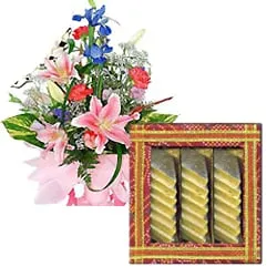 Diwali Gift of Mixed Seasonal Flower Bouquet with Kaju Katli 1 kg. Gross weight applies.