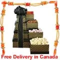 Four Tier Celebration Pack with 4 Free Rakhi. Four Tier Hamper containing Eatables like Citrus Gems, Roasted Almonds, Raspberry Tea Cookies and White Chesse Popcorn beautifully wrapped in black and gold boxes. An excellent Gift.