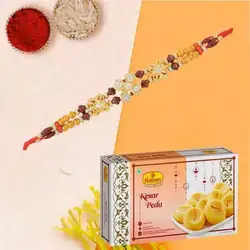 Complete your preparations for a grand Raksha Bandhan celebration by ordering for this Enthralling Gift of Assorted Pedas with Kesar which comes along with a free Rakhi, Roli Tilak and Chawal to make it grander. It contains 500 Gms of Pedas in a Pack. The formation of the Rakhi may comes with alterations depending on the availability.