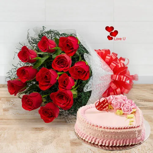 12 Red Dutch Roses Bouquet with Heart Shaped Cake 1 Kg