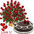 50 Dutch Red Roses Basket with 1/2 Kg. Chocolate Cake.