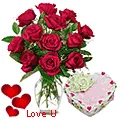 12 Red Roses in vase and A Fresh Baked Heart Shaped Cake 1 Kg.