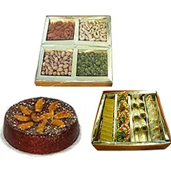 1 pound Plum Cake, Haldiram’s 1 kg Assorted Sweets and 1 kg Assorted Dry Fruits