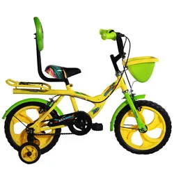Deliver this Tech-Embellished Fledgling BSA Champ Rocky Junior (14 inches) Bicycle as a surprise gift to a beloved lad and dazzle his day with elation. This Champ Rocky Junior Bicycle is furbished with fortes like Jaunty Low-Step-Through Frame, Integrated Carrier, Pistol Chain Cover, Tender and Amiable Saddle, Yellow-Green Textured Frame Lay-out, Chromatic Surface Basket and Deft Trainer Wheels.