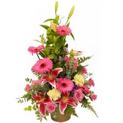 Make occasions grander with this Delightful Happiness Blooms Premium Arrangement of Mixed Flowers and share the moment with your loved ones. This Hand-gathered blushing tones of 5 Gerberas, 2 Lilies, 3 Carnations and 4 Roses.