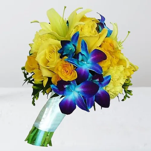 Observe a special occasion involving you and your MR Perfect with the essence of passion ringing in both of your hearts by buying this Zesty Bouquet of Brilliant Blossoms for him. Various ecstatic Blossoms such as 2 Yellow Lilies, 3 Yellow Carnations, 1 Orchid and 5 Yellow Roses get featured in this Bouquet with Mini Cadbury Celebration.