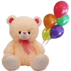 Wishes are delivered in the most stunning way by gifting this Soft Cuddly Love Teddy Bear (12 Inch) with 5 Brightly Coloured Balloons for lovely people in a lovely way.
