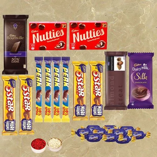 Amaze your brothers by gifting this Tempting Chocolates and make them crave for more. This alluring Combo comprises of 4 Cadbury Five Star, 4 Cadbury Perk, 1 Cadbury Silk, 1 Cadbury Temptation, 1 Cadbury Bournville, 10 Cadbury Eclairs, 2 Cadbury Nutties with Free Bhai Dooj Tika N Chawal.