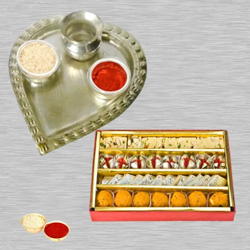 Silver Plated Paan Shaped Puja Aarti Thali (52 gms). with 500 Gms. Assorted Sweets from Haldiram with Roli Tilak and Chawal. Note: Gross Weight applies for Sweets.