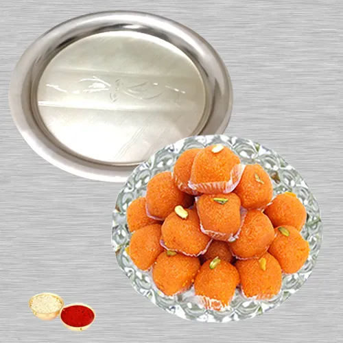Special Silver Plated Thali with 100 Gms. Ladoo from Haldiram with free Roli Tilak and Chawal. Note: Gross Weight applies for Sweets. Thali Size: 5-7 inch.