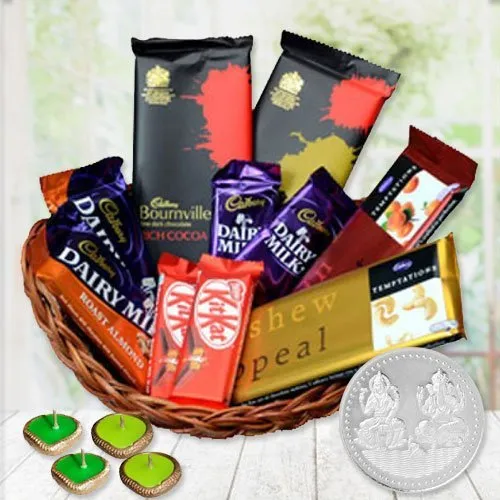 Send Diwali surprises by ordering this Mouth-Watering Collection of Delightful Chocolate Gifts and surprise your relatives and family. This Gift Collection is embraced with 2Pcs Cadbury Dairy Milk Roast Almond Bars, 2Pcs Cadbury Temptation Bars, 1Pc Cadbury Dairy Milk Chocolate Bar, 2Pcs Cadbury Bournville Chocolate Bars, 2Pcs Nestle Kitkat Chocolates, 1 Laxmi Ganesh Silver Coin and 4 Diyas in a Gift Basket.