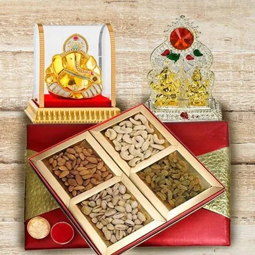 Let your bhai feel special with this Divine Vighnesh Ganesh with Mandap N Mixed Dry Fruits on the special event of Bhai Dooj. This gift comprises of finest Dry Fruits like Almond, Cashew and Raisins (200 g each) with decorated Vighnesh Ganesh Idol in a transparent case and an antique Ganesh Laxmi Mandap.