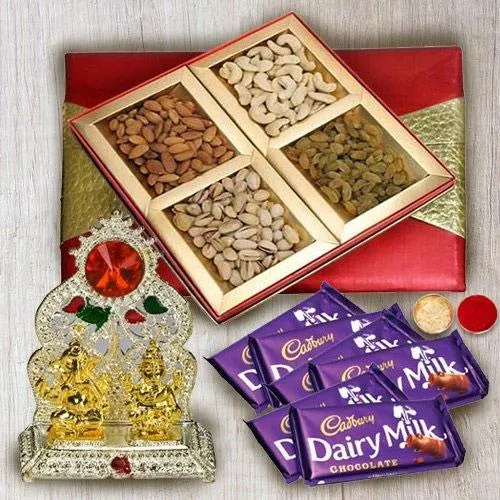 Moments turned out to be very special by ordering this Lovely Combo of Dry Fruits, Mandap N Cadbury Dairy Milk Chocolates and make your bhaiya feel happy on this Bhai Dooj. This Combo comprises of 200 gms Dry Fruits like Almond, Raisins, Cashew N Salted Pista along with 5 Pcs Cadbury Dairy Milk Chocolate (13 gms each) N an ethnic Ganesh Laxmi Mandap. Free Roli, Tika and Chawal is also included with the gift item.