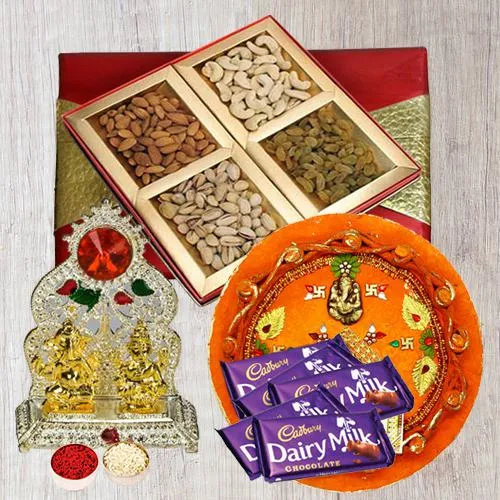 Convey your wishes for your bro with this gift of Assorted Dry Fruits with Decorated Pooja Thali N Chocolates. This Assortments comprises of 200 gms irresistible Dry Fruits like Almond, Raisins, Cashew N Walnut along with 5 Pcs Cadbury Dairy Milk Chocolate (13 gms each), a Ganesh Laxmi Mandap with Free Bhai Dooj Tika N Chawal.