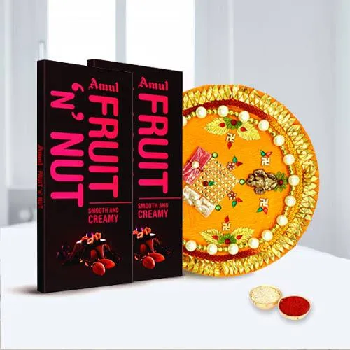 A classic choice for a fabulous gifts with this 2 pcs Amul Fruit n Nut Chocolate Bar N Designer Pooja Thali, will render your brother n sister-in-law with happiness and love with Free Bhai Dooj Tika N Chawal.