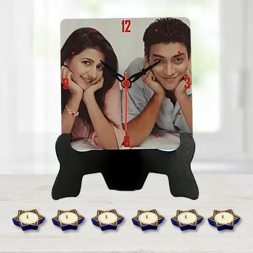 Send a Diwali Gift Combo of Attractive Personalized Photo Table Clock (4x4 in) with 16 pcs Ferrero Rocher n 6 pcs Free Designer Diya online and make your beloved ones happy.