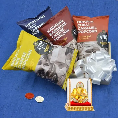 Love for brother is best expressed by sending this Classy Gift Hamper of Flavored Popcorn with Vighness Idol N Free Roli Tika to your near and dear ones on Bhai Dooj. This unique gift basket has -