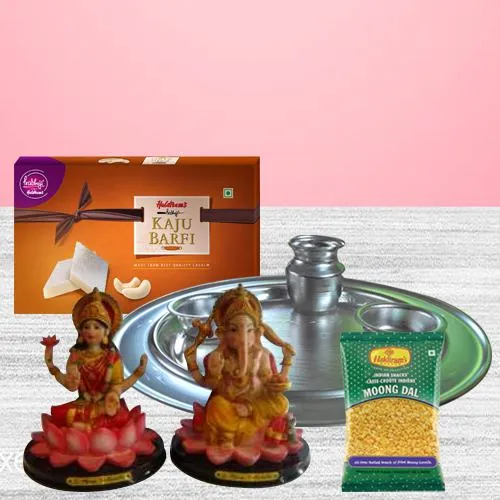 Splash liveliness into the lives of the people you care about by gifting this Finest Pooja Thali of Haldiram Khaju Barfi, Snacks n Lord Idol on Diwali that helps instantly rejuvenate the mood. This Deepavali Gift contains Silver Plated Thali, Haldiram Khaju Barfi (200 gm), Haldiram Moong Dal Fried (200 gm) and Laxmi Ganesh Idol.