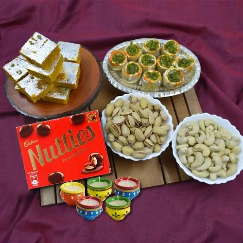 Wishes are delivered in the most stunning way by gifting this Tasty Haldiram Mithai n Dry Fruits Combo with Nutties n Wax Diya on Diwali for lovely people in a lovely way. This Deepavali gift hamper consists of: