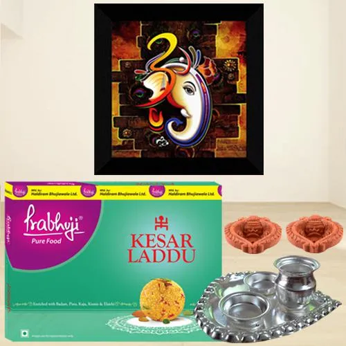Treat your special ones by ordering online this Ideal Paan Shape Pooja Thali with Lord Ganesha UV Frame Painting, Sweets n Diya for them and show how special a place they hold in your heart. This Deepavali gift contains Ganesha UV Coated Home Decor Frame Painting, Haldiram Kesar Laddu (250 gm), Silver Plated Paan Shaped Puja Thali n 2 pcs Teracota Mud Diya.