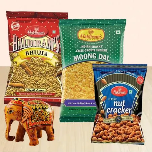 Bring the feeling of happiness by sending this Brass Metal Ganesha Dashboard Statue n Haldiram Snacks on Diwali into the life of your most special person. This Deepavali gifts comprises of Ganesha Murti Mini Brass Dashboard Statue, Haldiram Bhujia (200 g), Haldiram Moong Dal Fried (200 g) n Haldirum Nut Cracker (150 g).