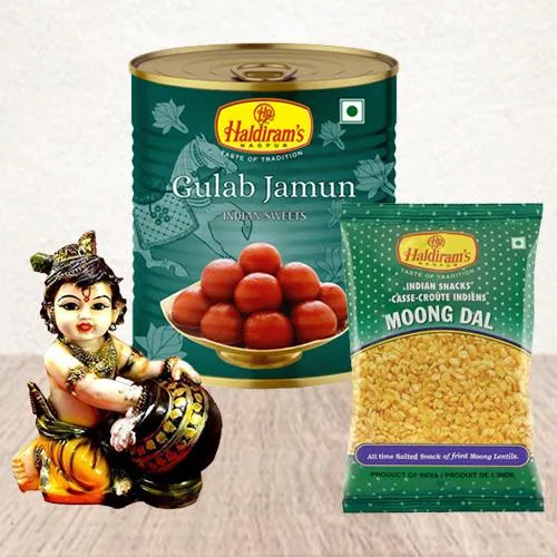 Mould your relationships into more special ones by sending this Cool Hand Carved Baby Krishna Resin Sculpture with Haldiram Snacks n Sweets on Diwali to the people you adore. This Deepavali gift contain Hand Carved Baby Krishna Resin Sculpture, Haldiram Gulab Jamun (500 g) n Haldiram Moong Dal fried (200 g).