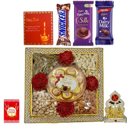 1. A Designer Pearl Decorated Square Tray consists of Cashews, Raisins, Almonds, Pistachios (500g Gross Wt) and 8 pc Sapphire Hazellfill Chocolate